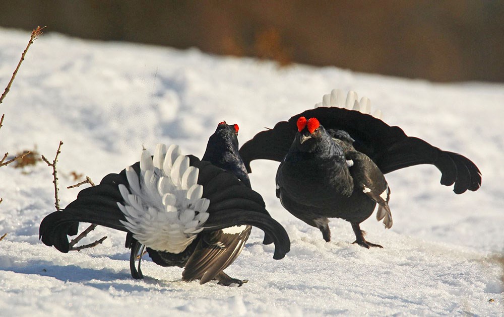Il gallo forcello o fagiano di monte (Tetrao tetrix) vive tra i 1600 ed i 2 mila metri di altitudine nella parte superiore del bosco, dove le conifere iniziano a diradarsi lasciando spazio a rododendri, ontani e mirtilli (foto di Dante Alpe).