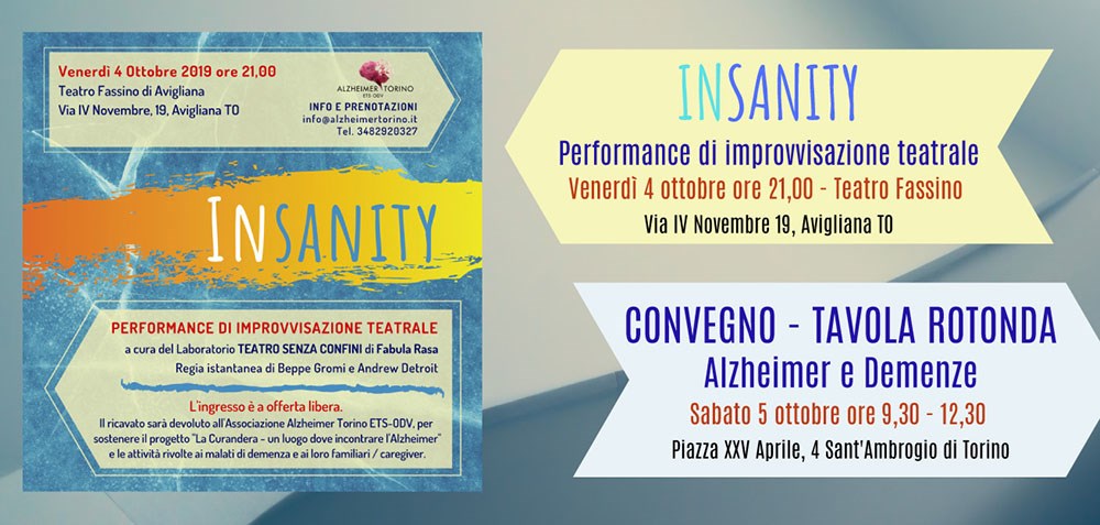 Venerdì 4 ottobre alle ore 21,00, presso il Teatro Fassino di Avigliana, la Compagnia Teatrale Fabula Rasa propone la performance di improvvisazione teatrale “Insanity”, con la regia istantanea di Beppe Gromi e Andrew Detroit. Accanto all'attività di formazione e di produzione di spettacoli per le scuole, negli ultimi anni Fabula Rasa ha focalizzato l'attenzione sul mondo della disabilità con “Teatro Senza Confini - Progetto sensibile d'integrazione tra le diverse abilità”. Il progetto muove i primi passi nel 1999 con un laboratorio teatrale per persone disabili e attualmente conta cinque laboratori teatrali integrati. Il percorso di T.S.C. ha portato all'ampliamento del nucleo artistico di Fabula Rasa con l'ingresso di cinque attori diversamente abili.