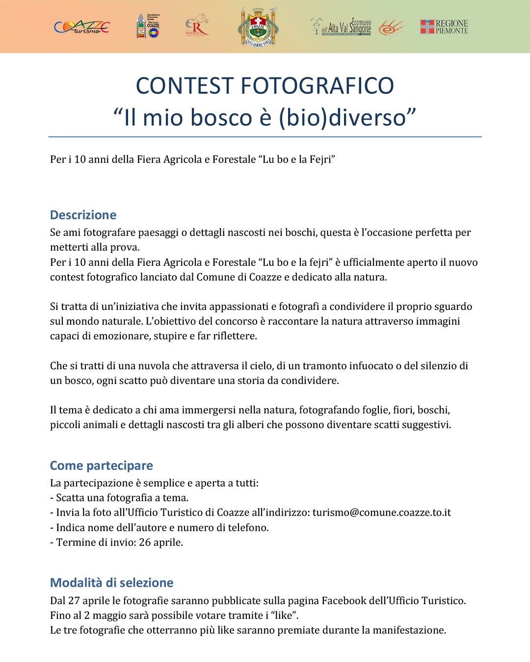 In occasione dei 10 anni della fiera, il Comune di Coazze ha lanciato il contest fotografico “Il mio bosco è (bio)diverso”, aperto a tutti. Tema: raccontare la biodiversità del bosco attraverso immagini suggestive (fogli, fiori, piccoli animali, dettagli nascosti).