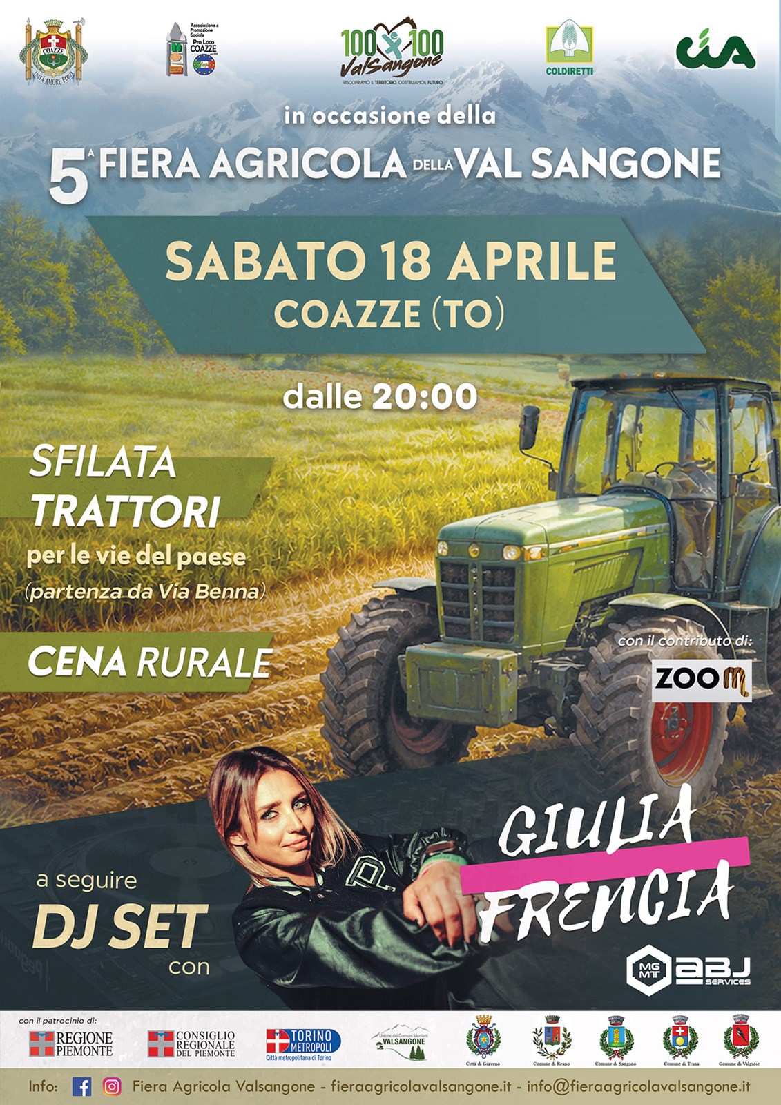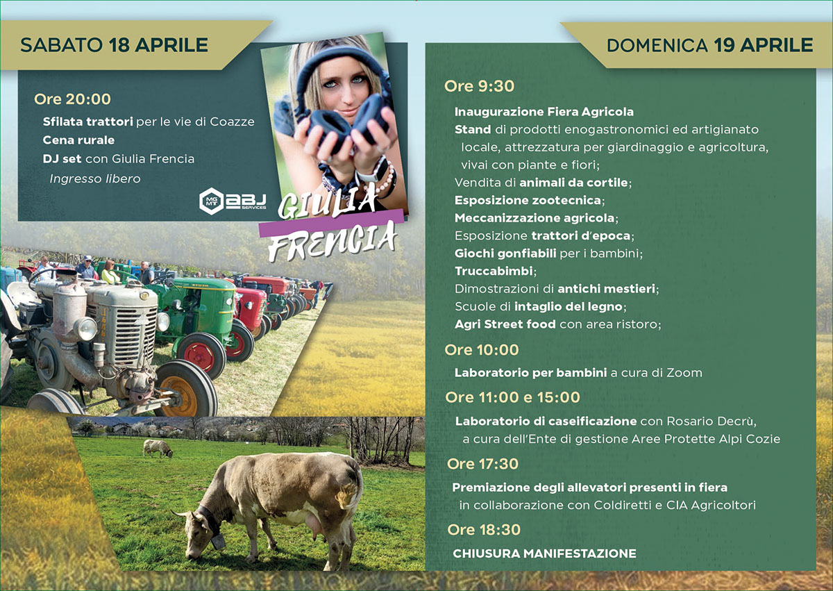 La festa inizia già sabato sera: a partire dalle ore 20:00, la sfilata dei trattori percorrerà le vie di Coazze con partenza da Via Benna. Al termine della sfilata, Pro Loco Coazze e i commercianti di Coazze assegneranno il premio al trattore più originale, per celebrare la creatività e la fantasia dei partecipanti. In concomitanza dalle 20:00, cena rurale per celebrare i sapori del territorio e, per concludere, DJ set con Giulia Frencia. Ingresso libero.