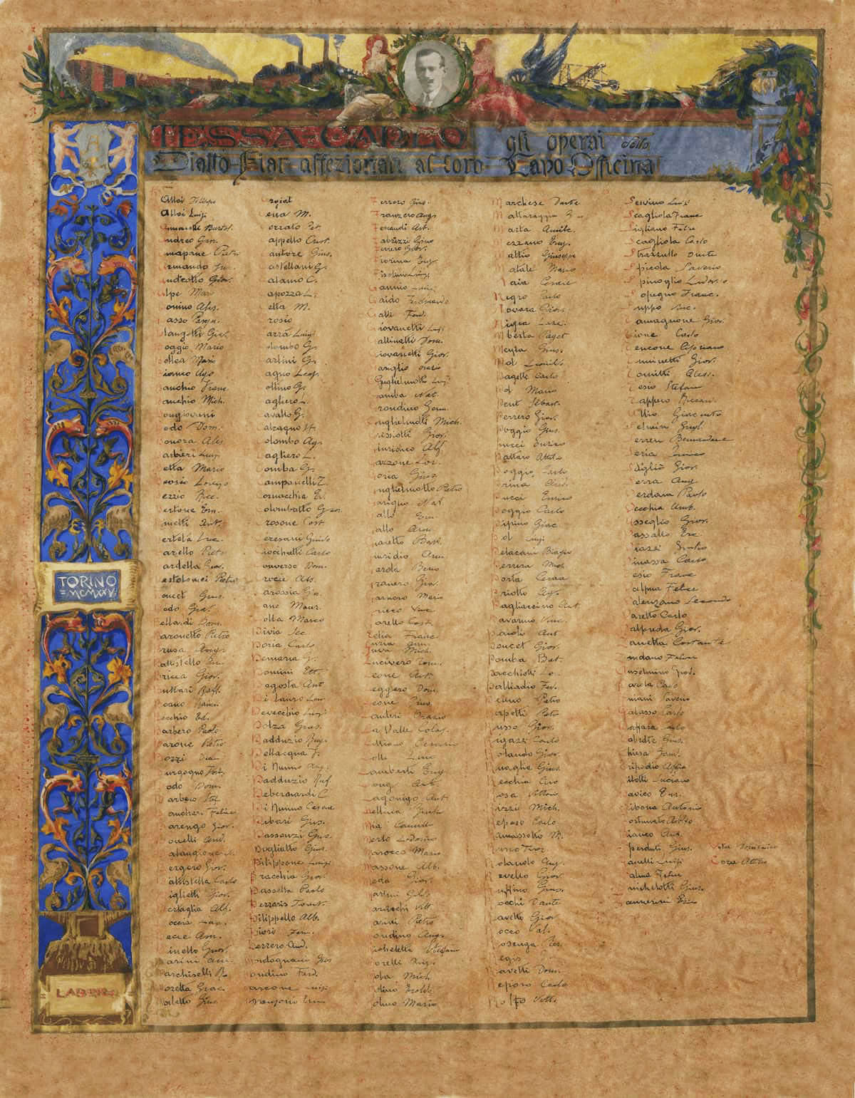 Ma non sono solo gli operai. Accanto c’è una seconda pergamena, più piccola e orizzontale, quella dei dirigenti: “A Carlo Tessa, che per venti anni dedicò il suo forte ingegno e la sua impareggiabile attività alla direzione dell’officina, i tecnici della Fiat sezione materiale ferroviario memori offrono”.