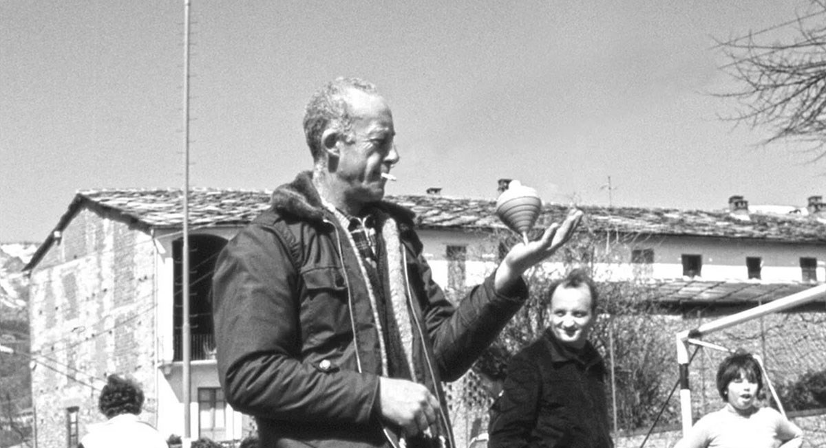 Nestore Tessa fa roteare la sàtula sul palmo della mano, durante un torneo del 1977 a Coazze.