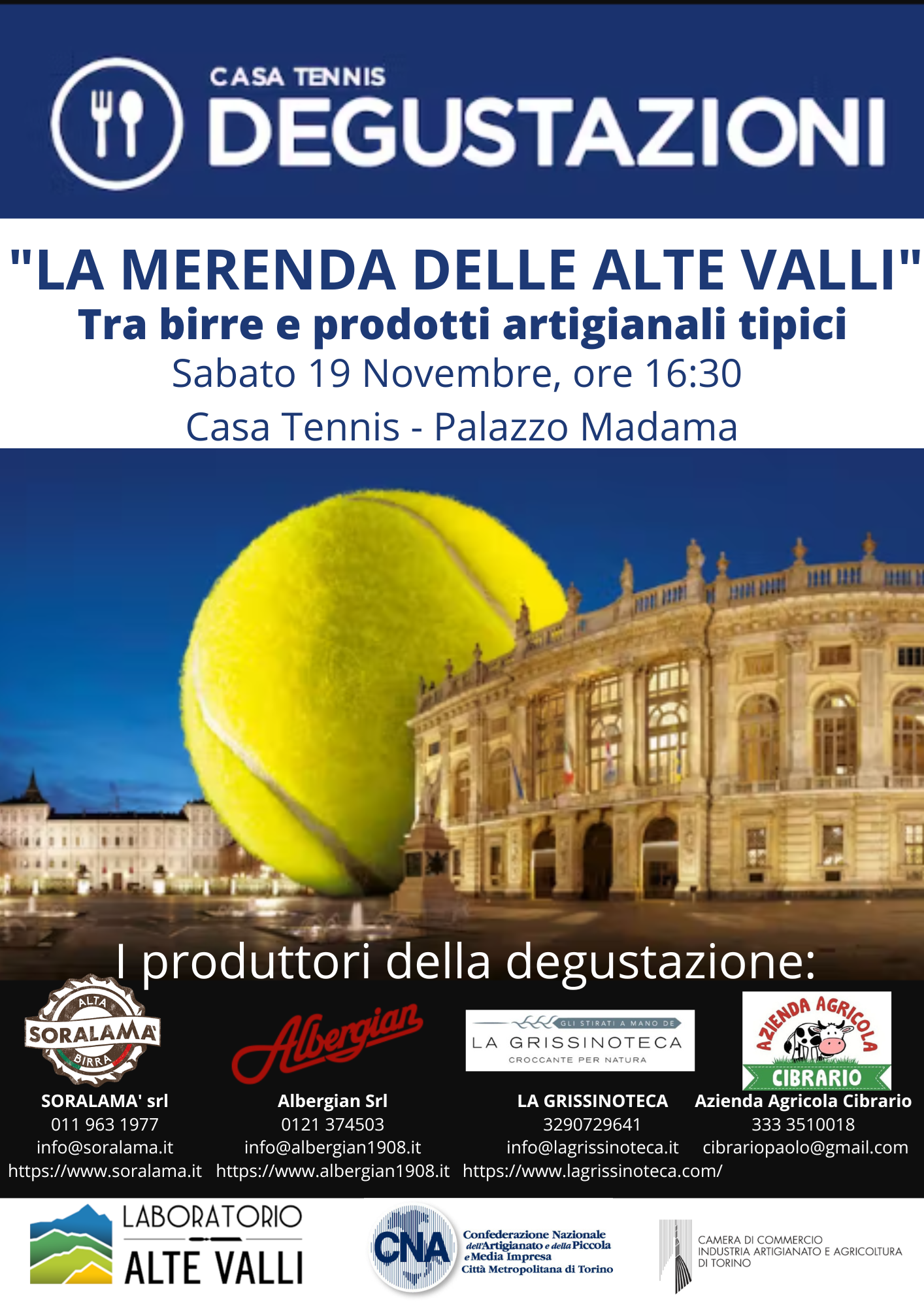 In occasione degli appuntamenti programmati per le Nitto ATP Finals, sono quattro le Aziende di Laboratorio Alte Valli che saranno protagoniste domani, ore 16:30, alla degustazione organizzata da CNA Torino e Camera di Commercio di Torino presso Casa Tennis di Palazzo Madama.