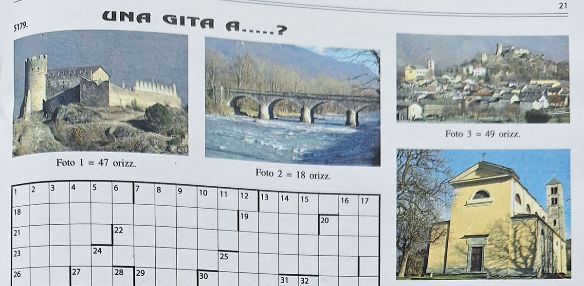 “Una gita a …?” ha debuttato nel 1958 ed è uno degli schemi di “parole crociate” più “anziano” della Settimana Enigmistica. La “gita” ha avuto altre volte come meta la nostra zona. Ma, caso abbastanza raro, ha toccato a poche settimane di distanza due località a noi vicine. Quali siano i paesi non è difficile da scoprire, visto che lo schema è corredato di fotografie.