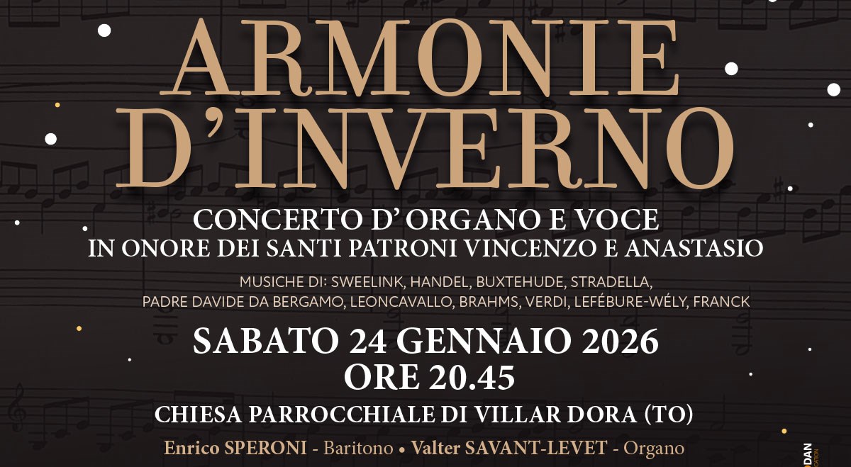 In occasione della Festa Patronale dei SS. Vincenzo ed Anastasio, sabato 24 gennaio presso la Chiesa Parrocchiale di Villar Dora si svolgerà un concerto di notevole levatura, che vedrà l’esibizione di due noti artisti del panorama musicale classico nazionale e internazionale: Enrico SPERONI, baritono, e Valter SAVANT-LEVET, organo.
