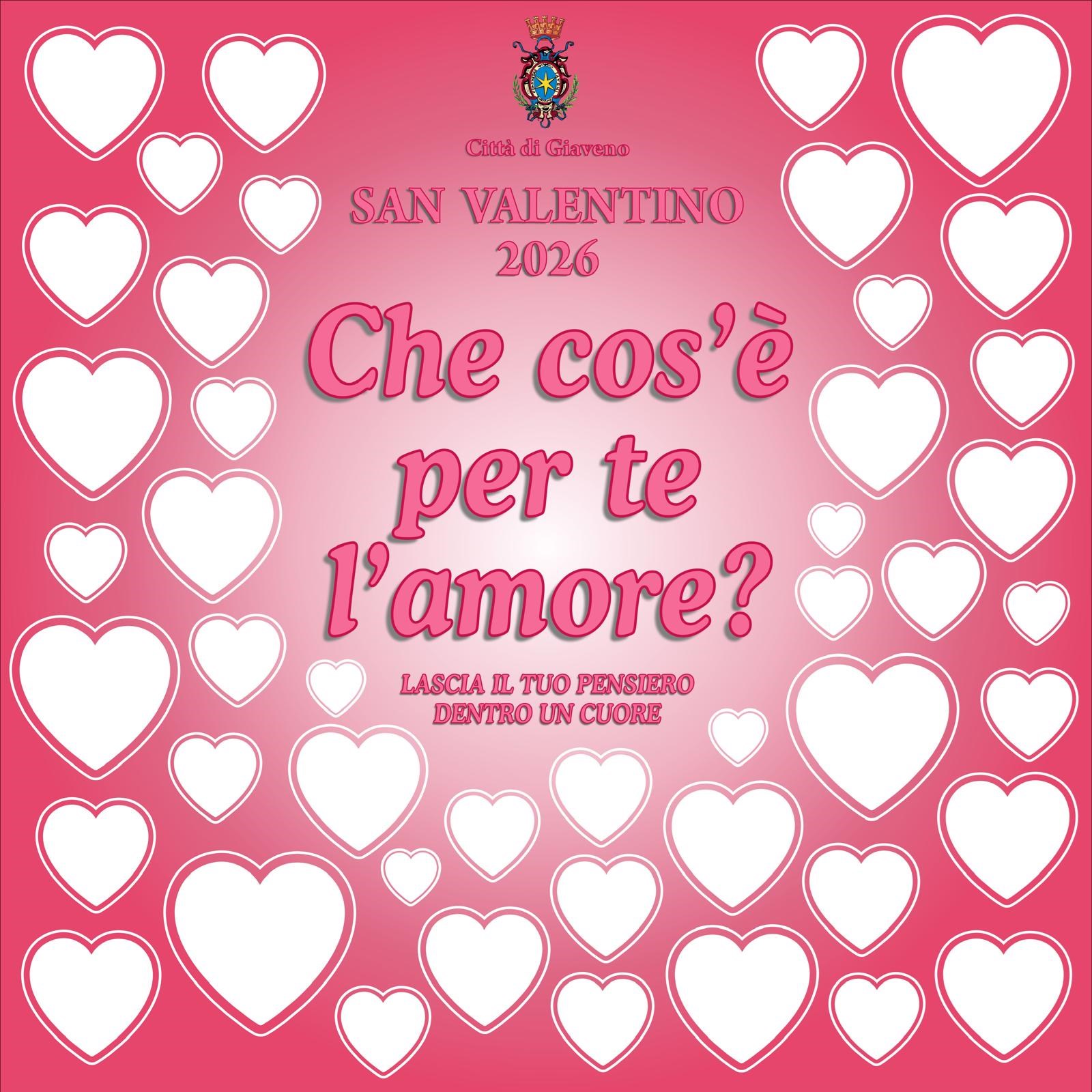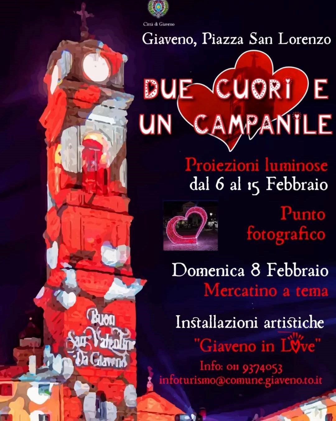 Per San valentino torna “Due cuori e un campanile”, ovvero l’iniziativa che trasforma Giaveno nella città dei cuori e dell’amore. Proiezioni luminose a tema (dal 6 al 15 febbraio) sulla Torre degli orologi e in piazza San Lorenzo, mercatino dell’amore domenica 8 febbraio, punto fotografico per immortalarsi dentro a un grande cuore rosso; inoltre, torna per il secondo anno, con alcune novità, anche Giaveno in L♥ve.