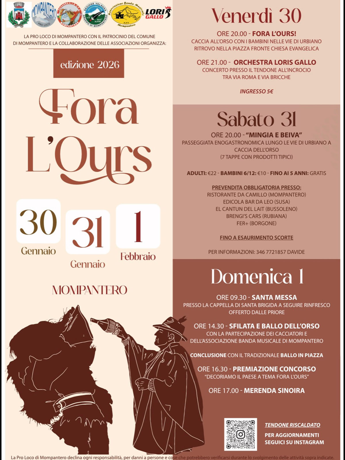 Dal 30 gennaio al 1 febbraio 2026, Mompantero si anima con uno degli eventi più attesi dell’anno! Tre giorni di tradizione, divertimento e buon cibo che culminano con la magica serata di sabato: la passeggiata “Mingia e Beiva” ("mangia e bevi", con prevendita obbligatoria), un viaggio enogastronomico lungo le vie del paese, accompagnati da musica e sapori unici… sempre a caccia dell’orso