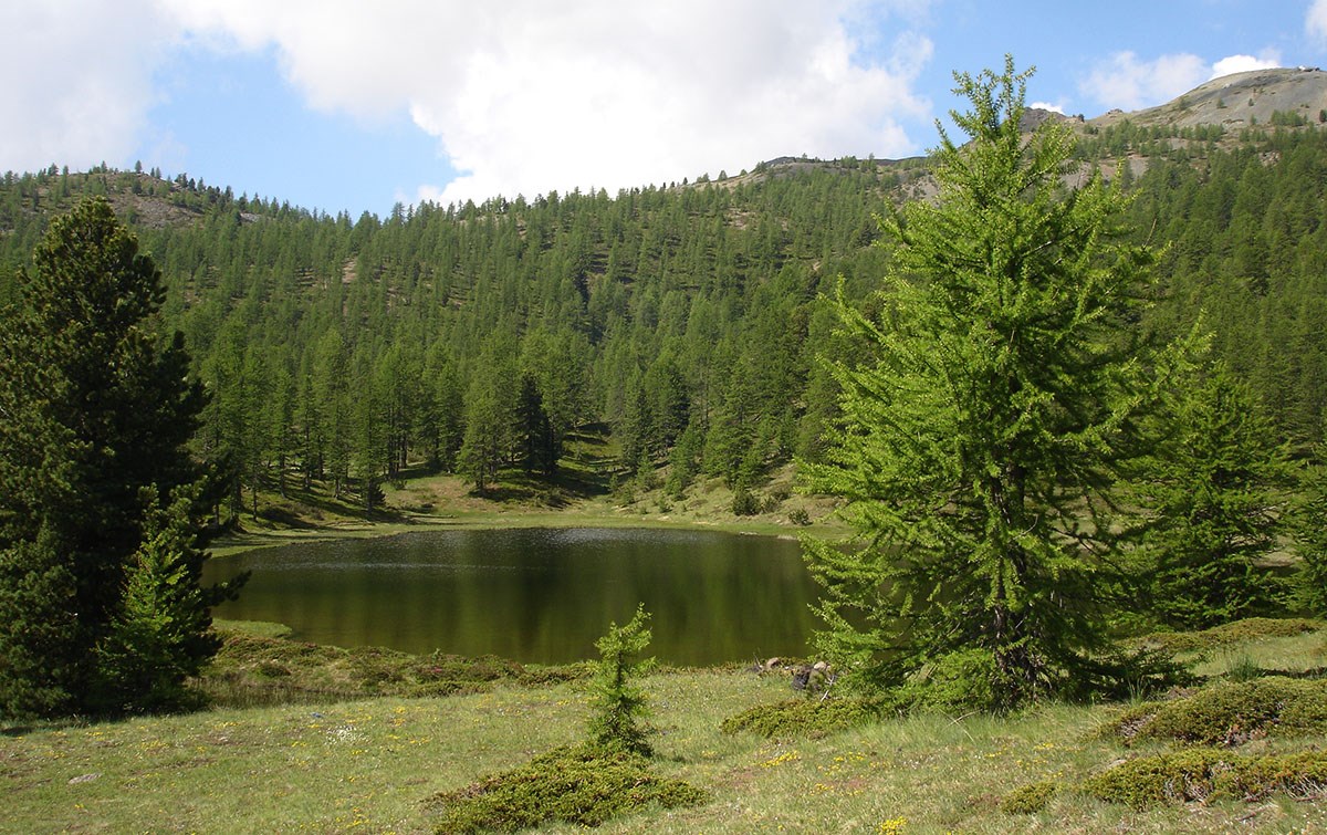 Si tralascia a destra la deviazione per la Rocca Remolon, si seguono i segni bianchi e rossi, si lascia a destra anche la deviazione per il colle Bercia e in leggera discesa e si giunge al lago Foiron (2130 m) tra prati fioriti e pini.