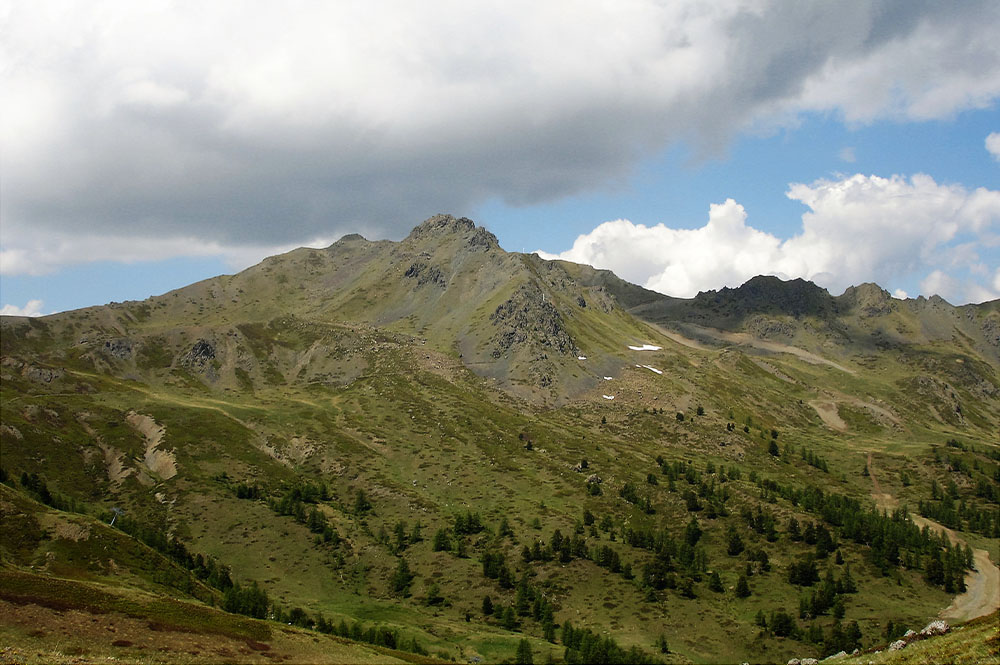 A questo punto è la cima dello Chaberton che domina il percorso e mano a mano che si sale appaiono anche il Seguret e il Vallonetto. Seguendo la carrareccia o tagliando i tornanti si raggiunge il col Saurel che comunica con la valle Gimont, dominata dalla cima omonima.