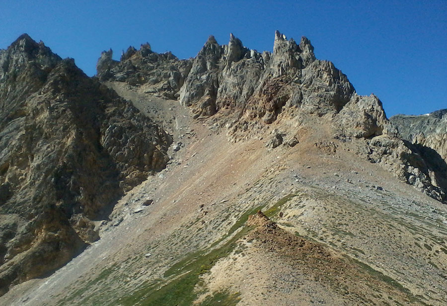 Si segue la traccia di sinistra che attraversa il ghiaione tra rari segni e si giunge sul colletto della Testa di Cane di fronte alle Roche de l’Enfouran. Il panorama è sconfinato sulla imponente pareti dei Re Magi e della valle Stretta fino alla Guglia Rossa.