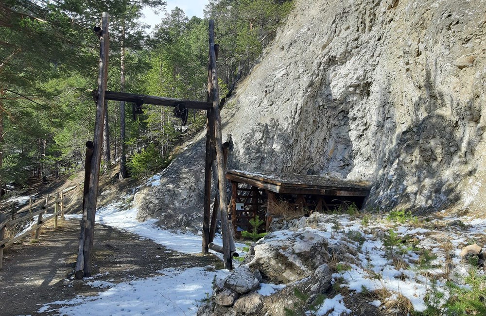 Dopo circa un’ora di salita (quota 1390 m circa) seguendo il sentiero segnalato, si raggiunge il sito minerario sfruttato tra il 1881 ed i primi anni ‘60. Le cave, sia a cielo aperto che in galleria, sparse lungo i due chilometri di filone, erano servite da carrelli su binari che affluivano a un sistema di discesa con teleferiche che portava il materiale grezzo all’area di lavorazione e stoccaggio a valle, in località Portetta.