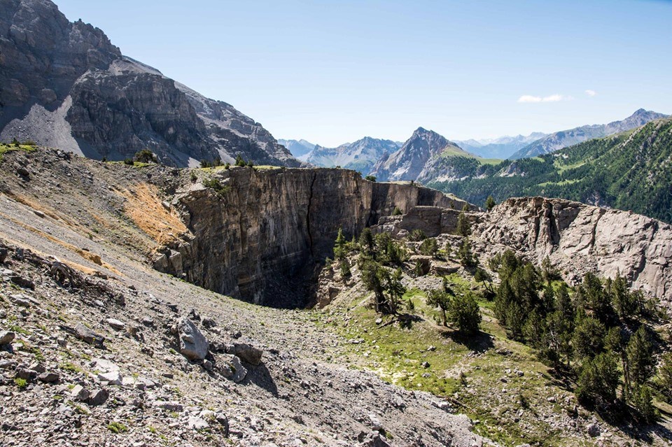 Dal fondo valle si vede l’ampia bastionata di rocce calcaree (le Bancs) che poggiano su un basamento di gessi microcristallini. I gessi sono meno resistenti all’azione di disgregazione e demolizione rispetto alle rocce circostanti, che sono dolomie e calcari; conseguentemente tendono a ridursi di volume e di spessore provocando un lento ma continuo collasso delle rocce sovrastanti.