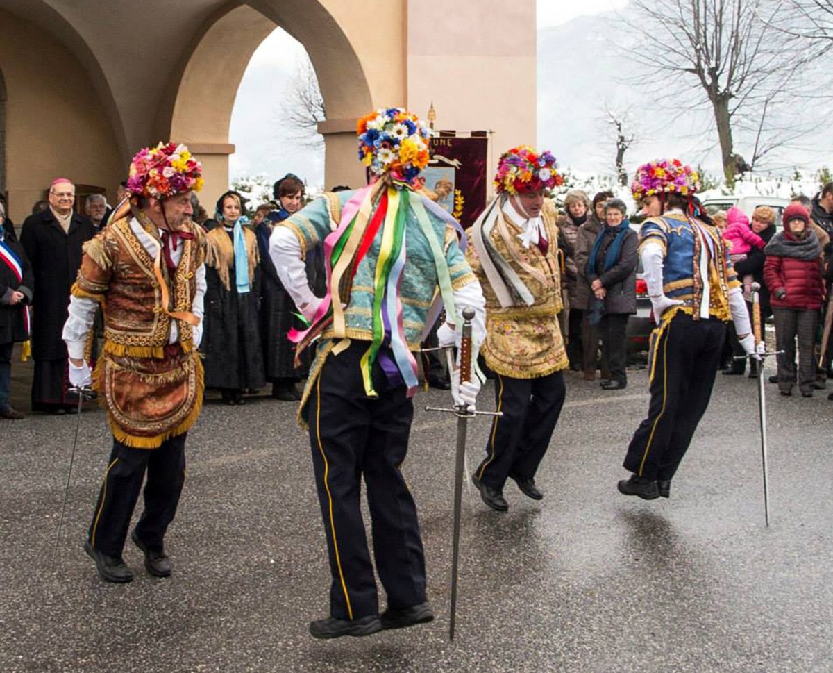 La Danza delle Spade è eseguita sul sagrato della chiesa dopo la Messa e i Vespri, di fronte alle Priore e al Bran su un poggio isolato dal resto del paese, al cospetto del Rocciamelone, in un luogo che probabilmente doveva essere sacro già in periodo preceltico. Gli spadonari eseguono un insieme ritmato di mosse con la spada, tra la scherma e la parata: formano un gruppo che poi si scioglie, intrecciano e urtano vicendevolmente le armi, le lanciano nell'aria e le riprendono al volo.