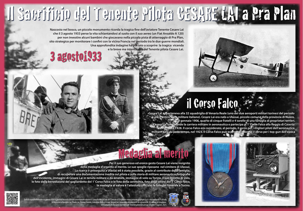 Aveva soltanto 27 anni Cesare Lai, il tenente sardo della Regia Aeronautica che il 3 agosto 1933, a seguito dello schianto dell’aereo che stava pilotando, perse la vita a Pra Plan (Prato Piano), nei pressi del forte di Santa Chiara a Giaglione.