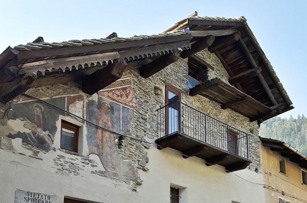 Sulla facciata, tracce di affreschi cinquecenteschi portati alla luce durante i restauri del 2016: una pietà e la raffigurazione di San Giacomo. Caratterizzato iconograficamente da un cappello a larga falda su cui è visibile la conchiglia, emblema del pellegrinaggio verso l’Oceano Atlantico. Che ci riconduce all’antica via della fede che portava a est, verso Roma e Gerusalemme, e a Ovest, verso Santiago di Compostela.