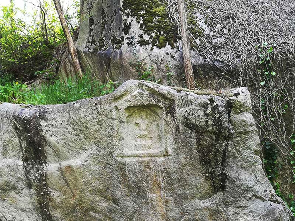 Si tratta di un’edicoletta scolpita nella roccia di un masso erratico sul lato sud della radura, di fronte alle coppelle. Raffigura un piccolo tempio e, all’interno di esso, un uomo stante, con in mano un falcetto e un bastone, con un mantello fissato alle spalle e un cane ai suoi piedi. L’iscrizione è molto rovinata, e sono state date interpretazioni diverse: chi ci ha visto il dio Vertumno, di origine etrusca, chi Giove dolicheno, chi Annibale.