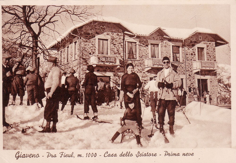 A Pra Fieul, a poca distanza dalla baita di Kind, tra il 1929 e il 1930 Oreste Taverna, il proprietario del rinomato Caffè Commercio di Giaveno, iniziò la costruzione dell’Albergo Rifugio Casa Sciatori. La struttura, gestita dal proprietario (che svolgeva anche funzione di custode) in collaborazione con la moglie Felicina, dal 1932 si fregiò sull’insegna e nelle pubblicità del titolo di “Rifugio del CAI Torino”. Molto frequentato d’inverno, come testimoniano queste cartoline d'epoca, l’hotel lavorava anche d’estate come luogo di villeggiatura.