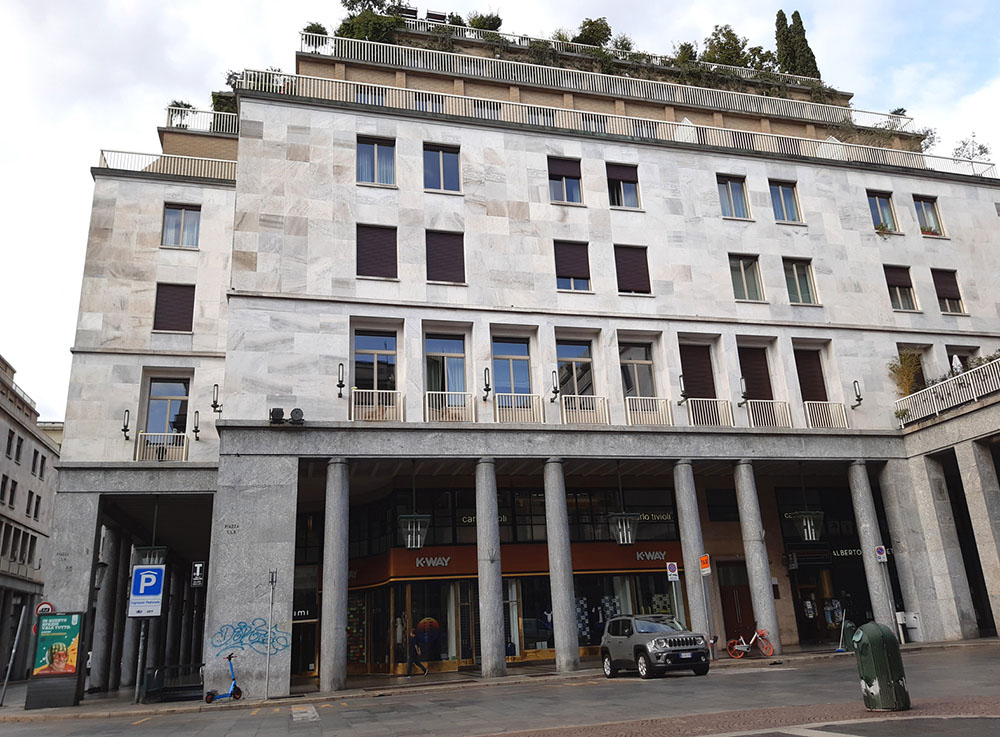 Lo stile architettonico razionalista di piazza CLN a Torino oggi. La facciata era quella del tristemente famoso Albergo Nazionale sede della Polizia di Sicurezza nazista che comprendeva il controspionaggio della Gestapo. Qui venivano interrogati i partigiani detenuti nel braccio tedesco del carcere Le Nuove come Angiolino. Paradossalmente a fianco delle stanze delle torture era funzionante un albergo/ristorante per gli ufficiali nazisti. (Foto JF)