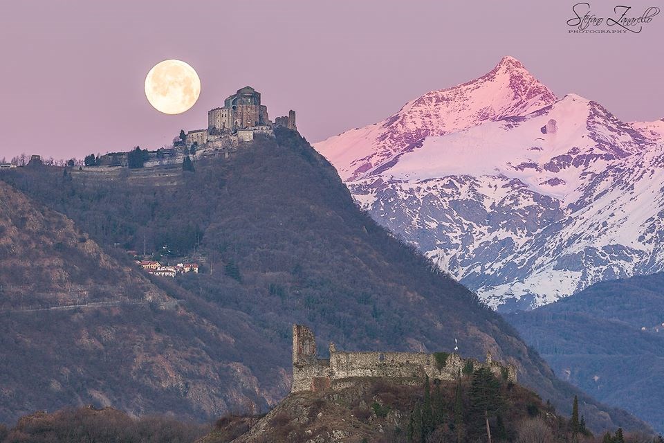 11 gennaio 2020, Stefano Zanarello, Il trittico Sacra di San Michele, Castello di Avigliana e Rocciamelone si sveglia all'alba impreziosito dalla luna piena