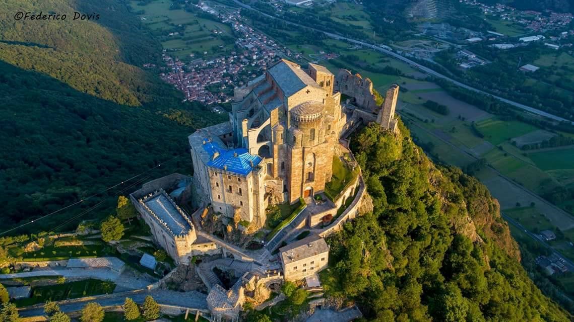 Affascinati dalla bellezza della Sacra di San Michele, spesso non si presta grande attenzione ai ruderi della Torre della bell'Alda, che sorge a breve distanza e si osserva molto bene dal terrazzo esterno della millenaria abbazia (a destra nella foto in alto, scattata con il drone da Federico Dovis).