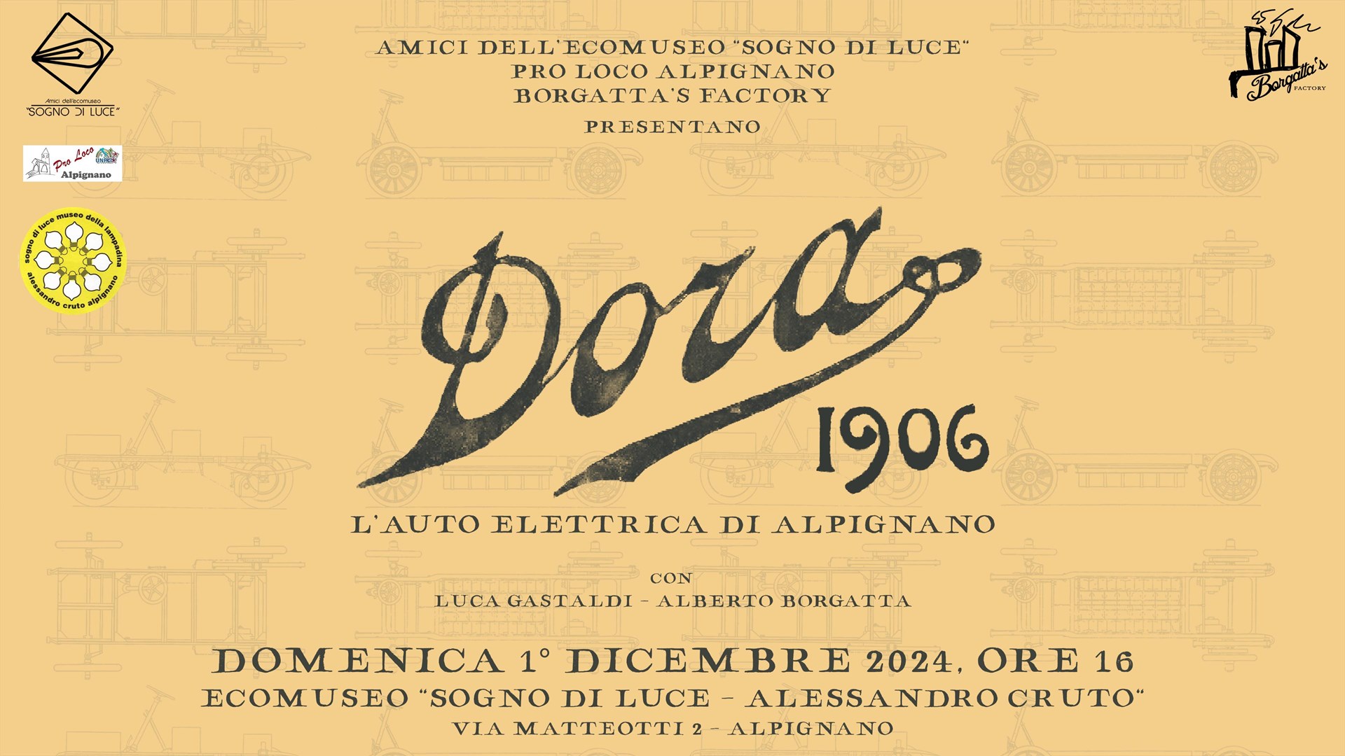 Nell'ambito dei festeggiamenti del Ventennale dell'Ecomuseo "Sogno di Luce - Alessandro Cruto" la storia della Dora rivivrà in un'intervista impossibile tra presente e passato dell'auto elettrica, che vedrà protagonisti Luca Gastaldi, giornalista e responsabile dell'Ufficio Stampa dell'ASI (Automotoclub Storico Italiano) e Alberto Borgatta (Borgatta's Factory). L'evento è organizzato da Borgatta's Factory, Amici dell'Ecomuseo Sogno di Luce e Pro Loco Alpignano.
