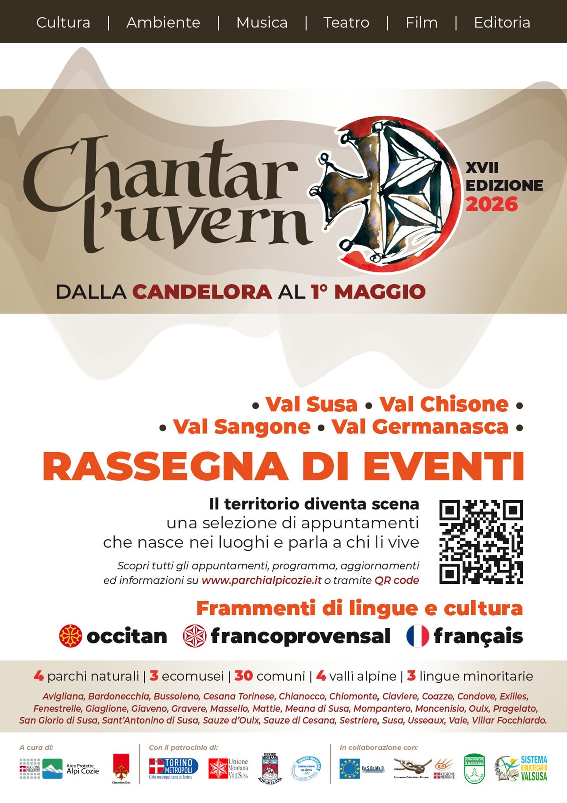 Bussoleno ospiterà l’evento di apertura domenica 1° febbraio 2026, alle ore 15, presso il centro polivalente con il progetto TSANT’AN TSAMIN, per il lancio della rassegna, con la restituzione al territorio dell’antologia TSANT’AN TSAMIN, seguita da un laboratorio di canto; si concluderà nel tardo pomeriggio con musica e ballo a cura del gruppo Blu l’Azard. Per tutto il mese di febbraio l’animazione proseguirà a Coazze, Gravere, Fenestrelle, San Giorio di Susa, Sauze di Cesana, Sauze d’Oulx e Giaglione con una tappa a Salbertrand particolarmente qualificante per la rassegna.