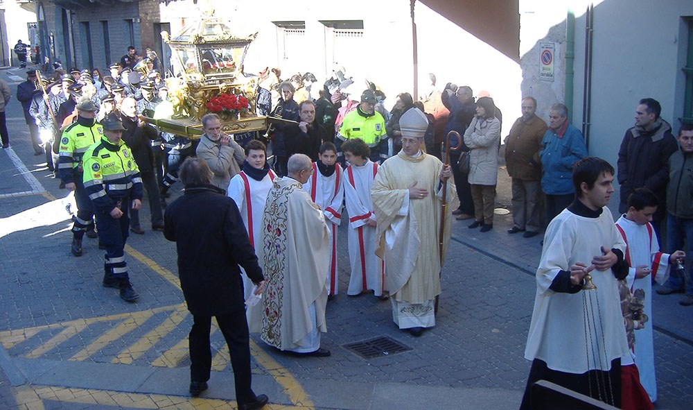 Vengono portate in processione al termine della messa domenicale del giorno di festa. Ad accompagnarle sono le rappresentanze dell'amministrazione comunale, dell'associazionismo locale e della società Abbadia muniti di alabarda.