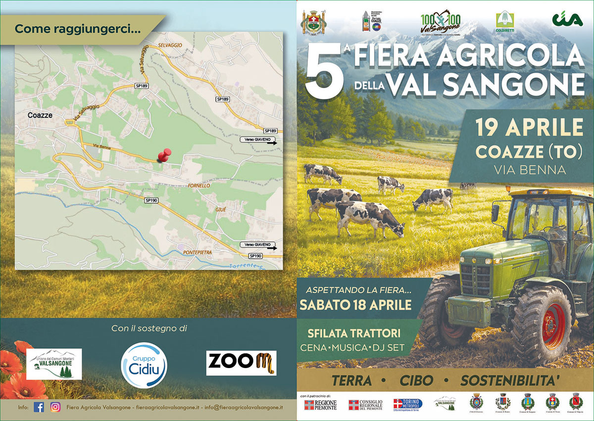 Sabato 18 e domenica 19 aprile 2026, la Fiera Agricola della Val Sangone torna protagonista a Coazze. Due giorni di festa per grandi e piccini all'insegna dell'agricoltura, della zootecnia, dell'artigianato locale e dei sapori autentici del territorio: un appuntamento imperdibile che celebra la cultura rurale e le tradizioni della montagna piemontese.