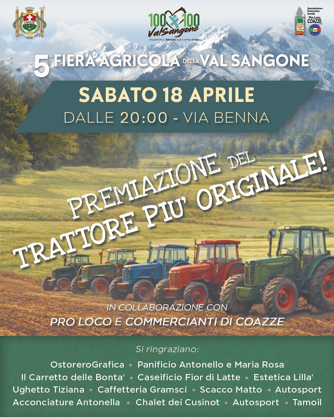 La festa inizia già sabato sera: a partire dalle ore 20:00, la sfilata dei trattori percorrerà le vie di Coazze con partenza da Via Benna. Al termine della sfilata, Pro Loco Coazze e i commercianti di Coazze assegneranno il premio al trattore più originale, per celebrare la creatività e la fantasia dei partecipanti. In concomitanza dalle 20:00, cena rurale per celebrare i sapori del territorio e, per concludere, DJ set con Giulia Frencia. Ingresso libero.
