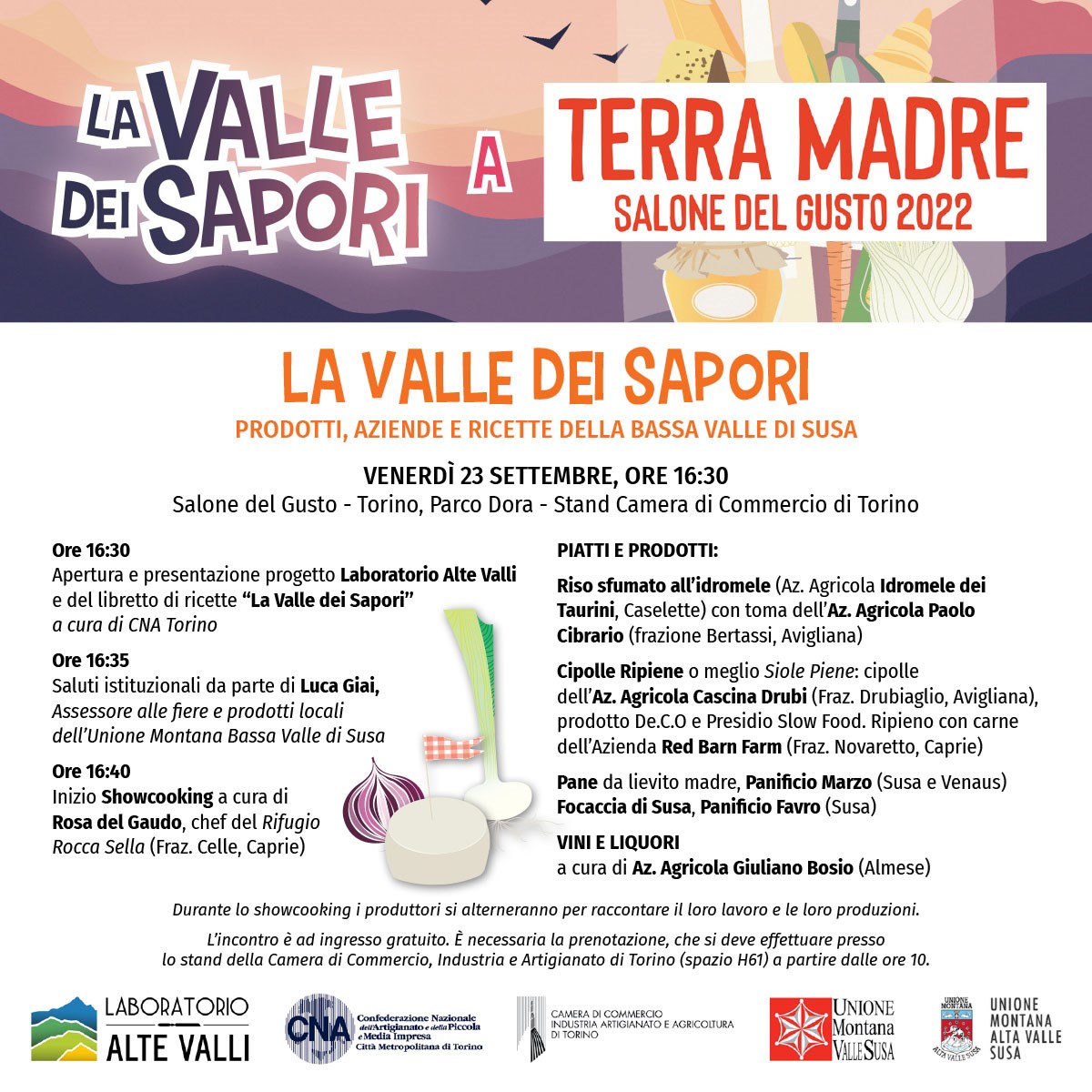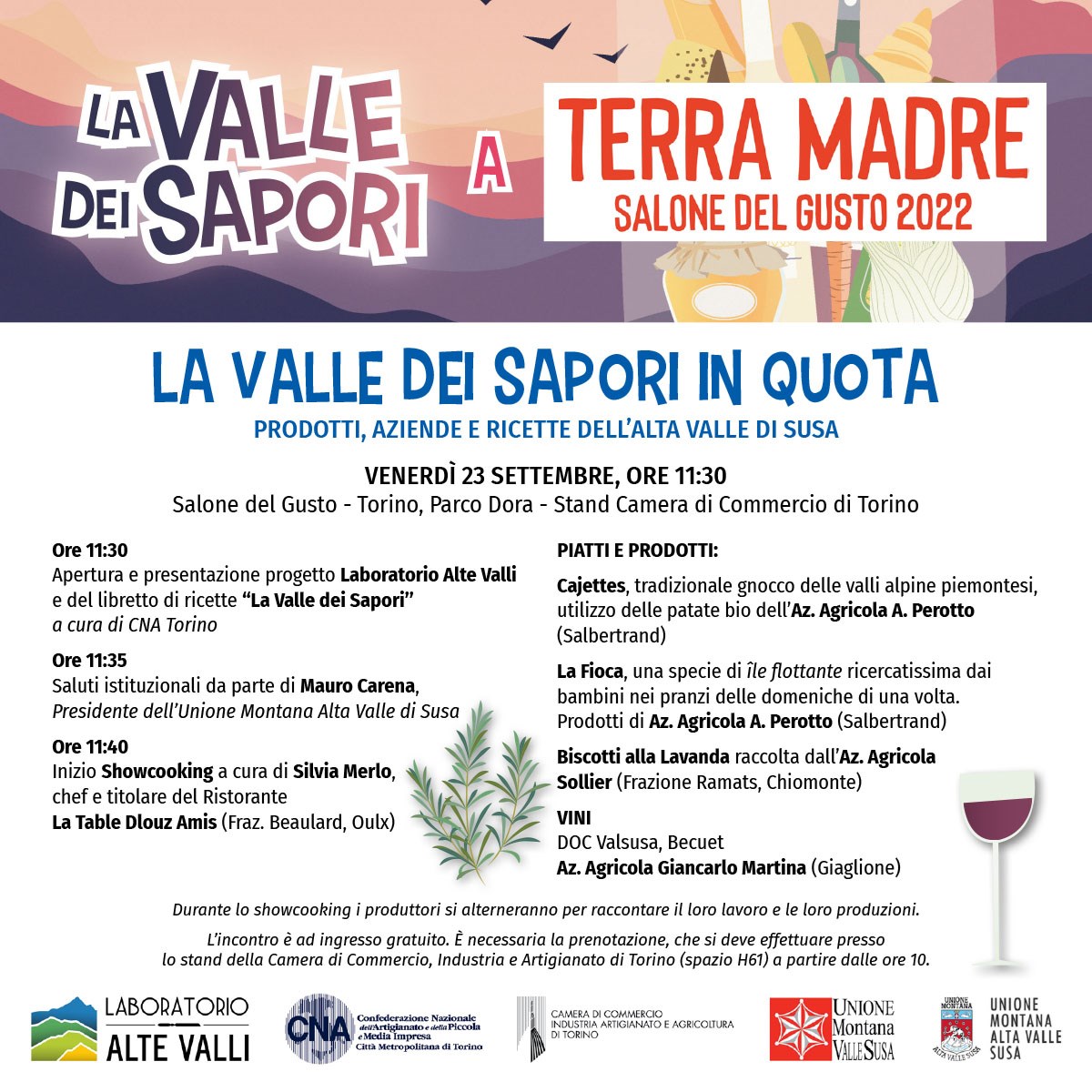 Grazie al lavoro di coordinamento realizzato in collaborazione con alcune imprese e chef da sempre vicini al progetto Laboratorio Valsusa (ormai Alte Valli) e sotto la regia di CNA Torino, anche la Valle di Susa sarà presente a Terra Madre Salone del Gusto 2022, manifestazione enogastronomica organizzata da Slow Food, Regione Piemonte e Comune di Torino che riunisce ogni due anni produttori e artigiani del settore agroalimentare di tutto il mondo.