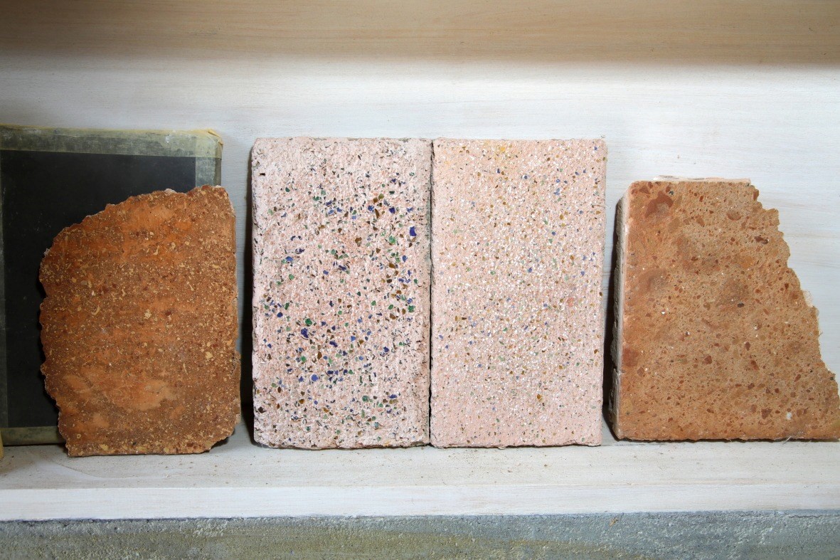 E, in base all'effetto ottico finale che si vuole andare a creare, c'è ancora l'inserimento nella miscelatrice che amalgama i componenti, delle più svariate essenze e materie: dalla cenere estratta dalla stufa alla farina di mais, debitamente setacciate, fino ad arrivare a diverse tipologie di spezie naturali usate in cucina, oppure al sughero, alla canapa e ancora alla grafite argentata o ai gusci di conchiglie del Mediterraneo.