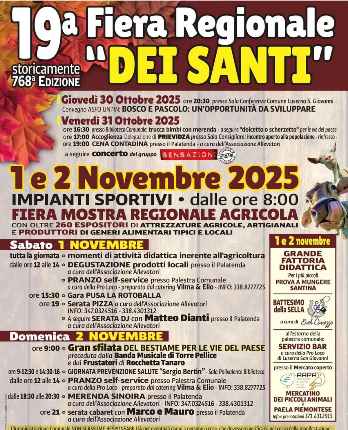 La kermesse raccoglie da sempre una grande partecipazione. Ci saranno 260 espositori, di cui circa 100 sono banchi di prodotti alimentari. Per quanto riguarda gli animali, si aspettano 600 bovini e un migliaio di ovi caprini; le mandrie sfileranno in centro. La Pro loco organizza la serata di Halloween, mentre gli Allevatori prepareranno il pranzo a degustazione. Tornerà anche la fattoria didattica e, novità di quest’anno, i balli de "La Meiro" di fronte al Comune nel pomeriggio del 1º novembre. Al termine della Fiera, la gara di mungitura.