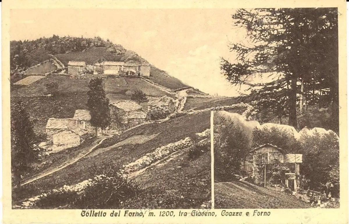 In questa immagine d’epoca si vede come vi fossero al Colletto due nuclei di baite, di cui uno è ormai quasi diroccato. Nel riquadro è stata aggiunta la villa del pittore Maurizio Guglielmino, che sporgeva dal declivio verso Forno ed era un edificio più complesso di quello attuale, come si vede dalla foto seguente, di Bartolomeo Vanzetti. Al suo fianco un modesto cippo ricorda Maurizio Guglielmino.