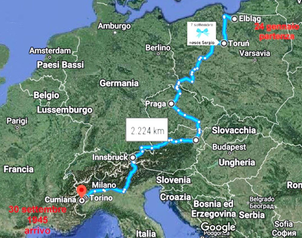Il 21 settembre saliamo in tradotta per rientrare in Italia. Per procurare il latte per Sergio una volta Evasio e l’amico rischiano di perdere il treno. Al confine italiano ci spruzzano per la disinfestazione, la sera del 29 settembre arriviamo a Porta Nuova a Torino. Sergio ha 22 giorni.