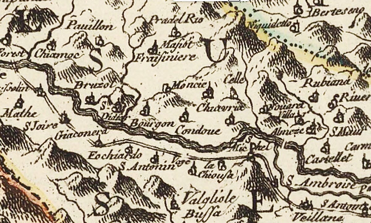 Un tempo, in Val di Susa, i toponimi francesi giungevano anche in Bassa Valle. Per esempio, come si vede da queste e da altre carte, esistevano «Jaillon», «Chaumont», «Gravères», «St.Didier», «Condoue», «St. Joire», «Chianoc», «Bruzol», «S. Ambroise», «Veillane», a cui corrispondono gli attuali «Giaglione», «Chiomonte, «Gravere», «San Didero», «Condove», «San Giorio», «Chianocco», «Bruzolo», «Sant'Ambrogio», «Avigliana».