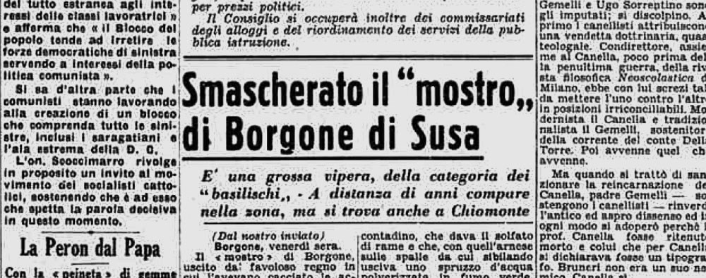 Di solito pensiamo che i mostri siano “esistiti” soltanto nell’antichità, eppure ancora nel 1947 gli abitanti di Borgone davano la caccia a un “rettile colla testa di gatto, le zampe di ramarro e una gigantesca cresta di gallo”, che era stato avvistato nelle vigne da un agricoltore.