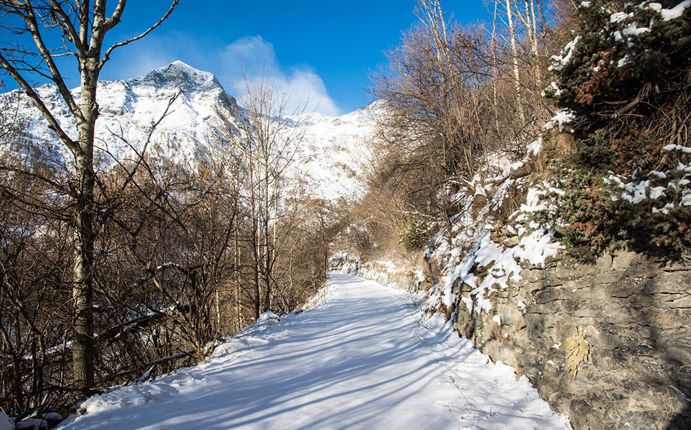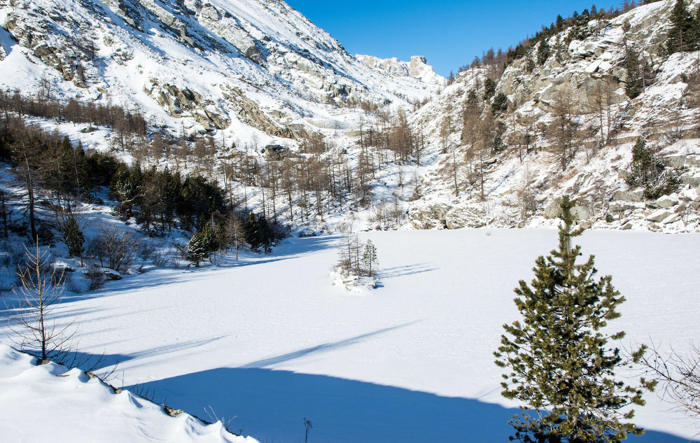 Arrivato al pianoro dove c’è il Lago d’Arpon si apre una magnifica vista sul Gruppo del Giusalet-Cima di Bard: sino a pochi decenni fa in questa conca c’era un bellissimo ghiacciaio, adesso solo più dei rimasugli! Però che meraviglia con la neve!