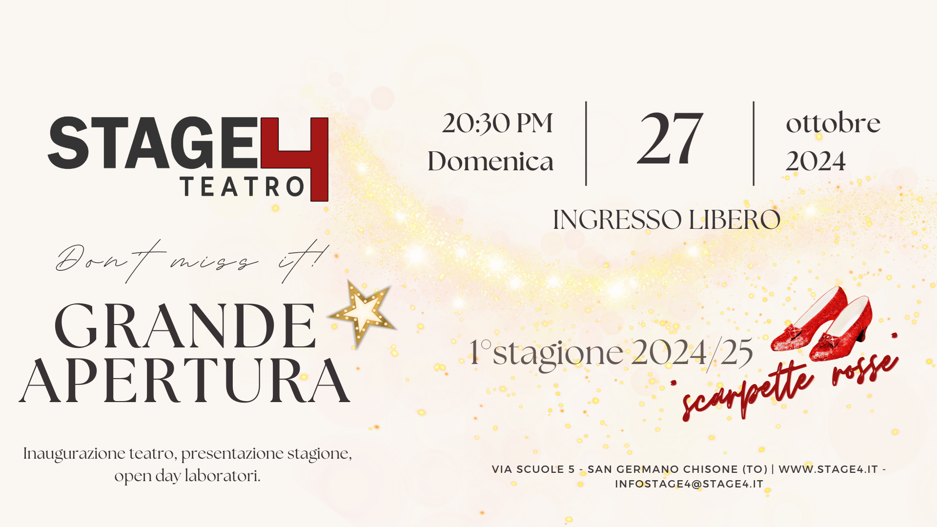 Domenica 27 ottobre si apre il nuovo spazio culturale "STAGE4", situato in via Scuole 5 a San Germano Chisone (TO). A partire dalle 20.30 con un evento speciale con ospiti artisti e tanti amici, dedicato alla presentazione della nostra prima stagione teatrale e dei nuovi laboratori di formazione per attori e appassionati di teatro.