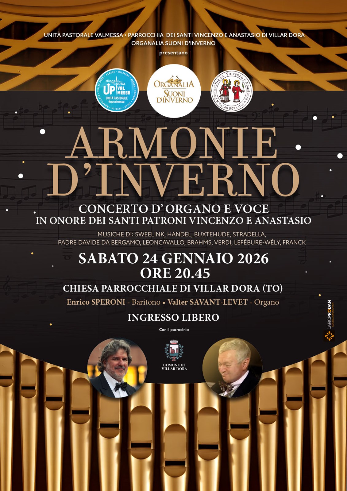 In occasione della Festa Patronale dei SS. Vincenzo ed Anastasio, sabato 24 gennaio presso la Chiesa Parrocchiale di Villar Dora si svolgerà un concerto di notevole levatura, che vedrà l’esibizione di due noti artisti del panorama musicale classico nazionale e internazionale: Enrico SPERONI, baritono, e Valter SAVANT-LEVET, organo.