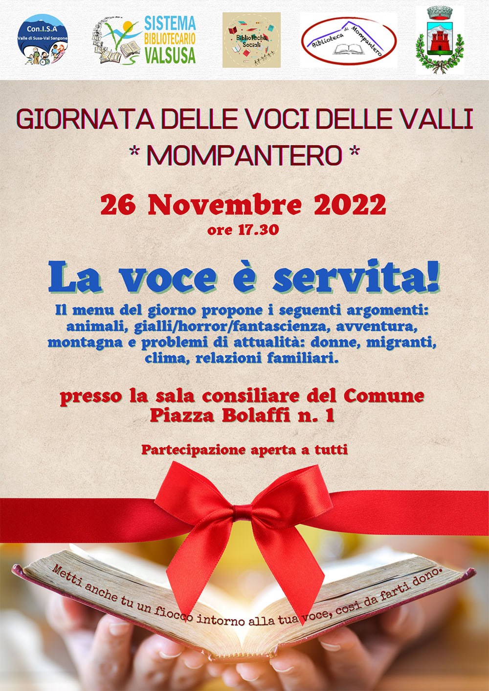 Sabato 26 novembre, molti spazi pubblici del territorio si animeranno con letture ad alta voce, in occasione della Giornata delle Voci delle Valli. Un’iniziativa frutto della collaborazione tra Sistema Bibliotecario Valsusa e ConISA Valle di Susa e Val Sangone, che si propone di celebrare il dono della voce che ognuno può portare agli altri, in semplicità.